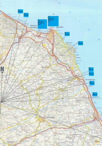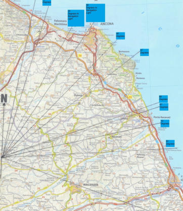 Diagram shows: The central point shows the location of il sorger del sole, the lines projecting show the number of compass degrees to each aspect. For example, 10° to Chiaravalle, 47° to Osimo, 73° to Recanati, etcetera. Location: 10 minutes’ drive to Cingoli famed as ‘The Balcony of Le Marche’ also listed as one of the most beautiful villages in Italy. 30 minutes to Ancona International Airport (Five further international airports close by) 45 minutes to Ancona ferry port and 33km’s to blue flag beaches at the Adriatic Sea. Note from owners: We are two British ex-pats Greg & Sandra and purchased the property in 2002. Sold as a whole and sold privately. Please click on the Contact us buttons to contact us for further photographs, information or about Le Marche - ‘All of Italy in one region’- thank you. Italy welcomes EU citizens and non-EU citizens who have a choice of entry visas for those seeking permanent residency including retirees. Press room: il sorger del sole featured during a live interview with BBC Radio and in A Place in the Sun & Yours magazines, Sunderland Echo & London I.