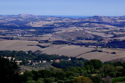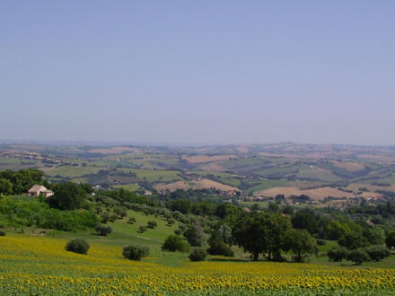 il sorger del sole, a magical ancient stone farmhouse commands a privileged and coveted position, beautifully set in about 1.7 Ha (4¼ acres) with aged olive groves. It provides a sense of retreat which is exhilarating. Immersed in a stunning location, surrounded by nature it has unsurpassed panoramic vistas, northwards towards Chiaravalle, birthplace of Maria Montessori, views of coastal resorts north of Ancona, Monte Conero and its nature park. Further sea views towards coastal resorts south of the Conero Peninsula and aspects of the Basilica at Loreto, this contains the holy shrine. Easterly towards the hilltop towns of Osimo and Recanati - birthplace of poet Giacomo Leopardi & opera tenor Beniamino Gigli, Potenza Picena and the open-air opera and university city of Macerata and distant Sant’Elpidio a Mare. Photographs: our sea views between Osimo and Loreto